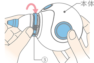 (1)シリコーン②を透明カップ①に回しながら挿入し取り付けます。